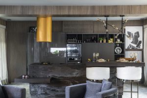 Já em 2019, foi a vez das arquitetas e sócias Anete Weber e Rafaella Marques, da WM Arquitetura, marcarem presença na mostra com o projeto Living Gourmet. Uma cozinha ou espaço gourmet de 95m² amplo e arrojado, com soluções que aliavam praticidade e sustentabilidade para contemplar o living, hall, área gourmet e lounge. Destaque para a porta deslizante revestida com espelho fumê, que combinava e valorizava todo o conjunto composto por cores escuras.